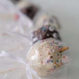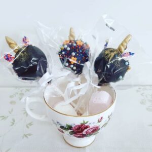 Cake pops are made from our delicious cupcake mix which is rolled into a ball and dipped into chocolate!