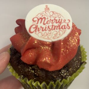 - Chocolate cupcake topped with Christmas red icing and a chocolate MerryCchristmas topper