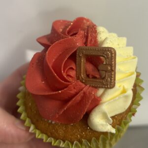 - Vanilla cupcake filled with raspberry red and white buttercream and a Santa Belt on top