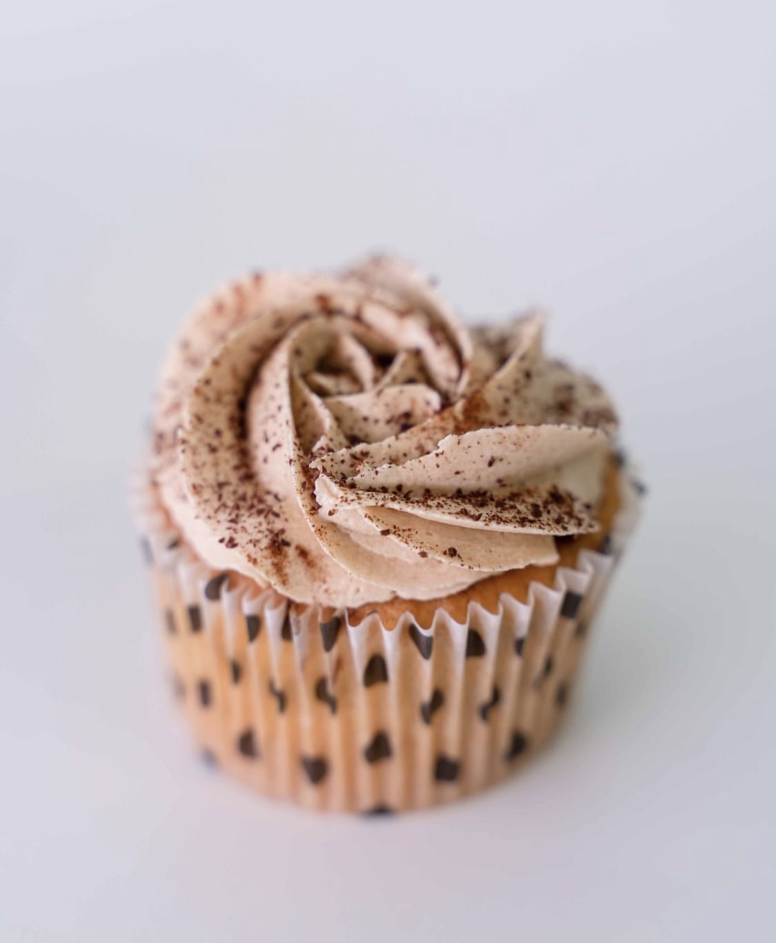 Vanilla cupcake brushed with espresso coffee, topped with espresso buttercream and sprinkled chocolate and cinnamon.