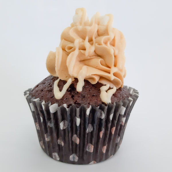 Chocolate cupcake stuffed with rich chocolate ganache, topped with coffee buttercream white chocolate drizzle.