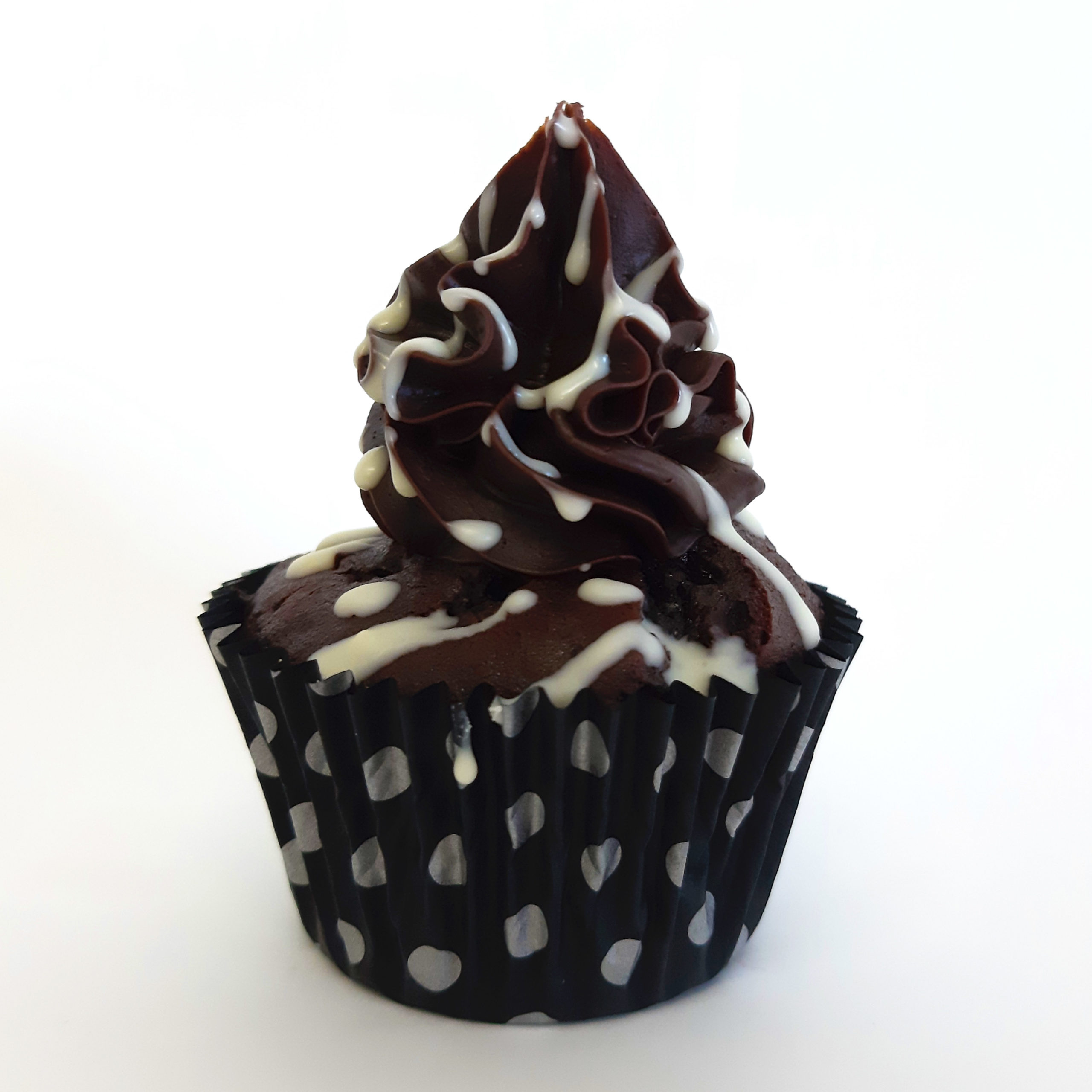 Double chocolate cupcake topped with rich dark chocolate ganache and white chocolate drizzle.