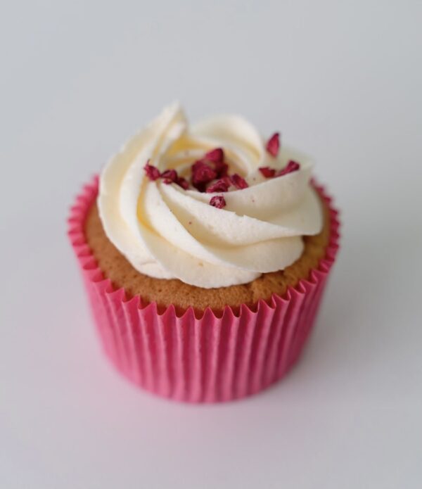 Vanilla based cupcake stuffed with a raspberry jam and topped with a cream cheese icing