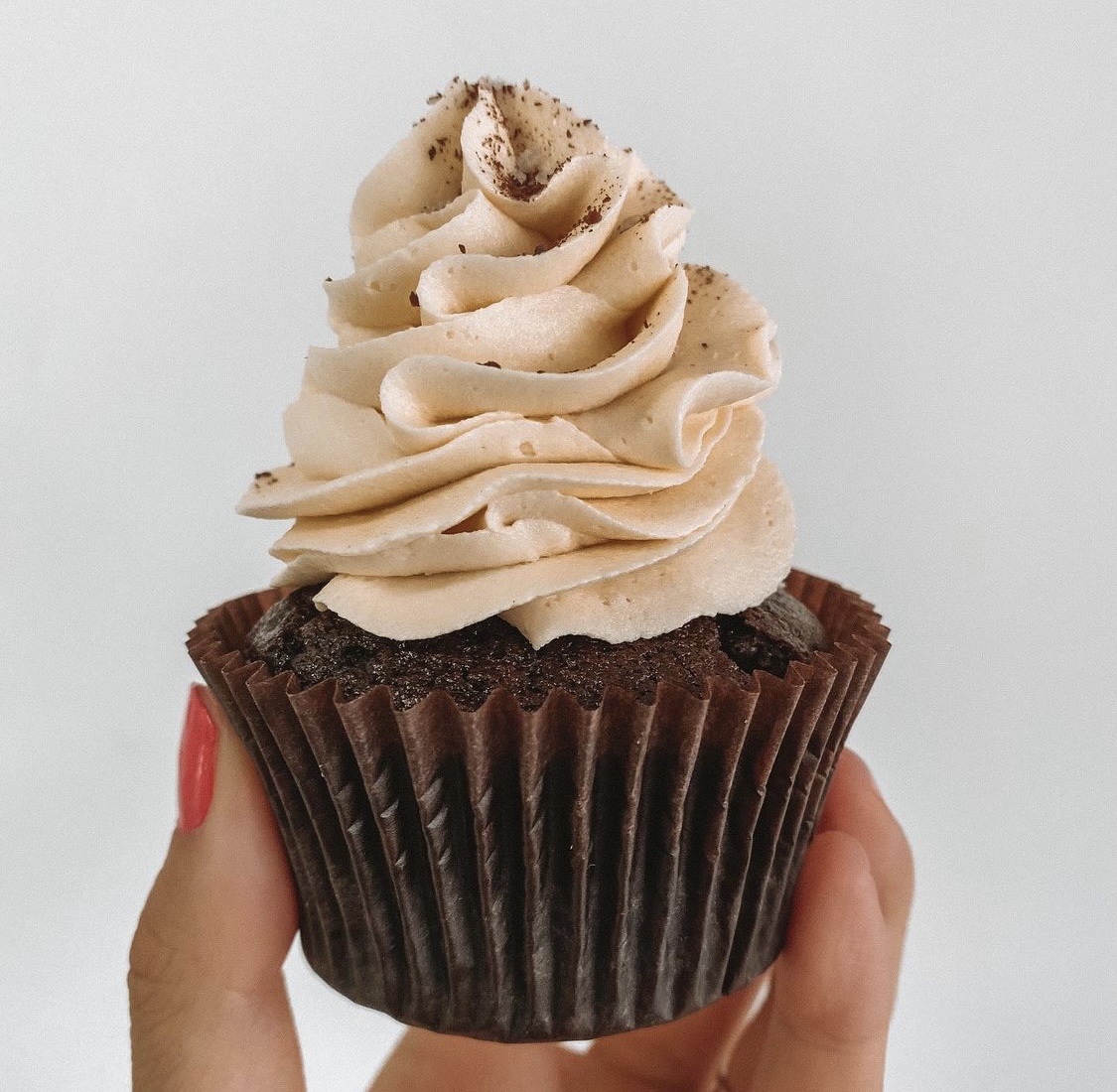 Chocolate cake stuffed with slated caramel topped with grated chocolate and sea salt on a salted caramel butter-cream